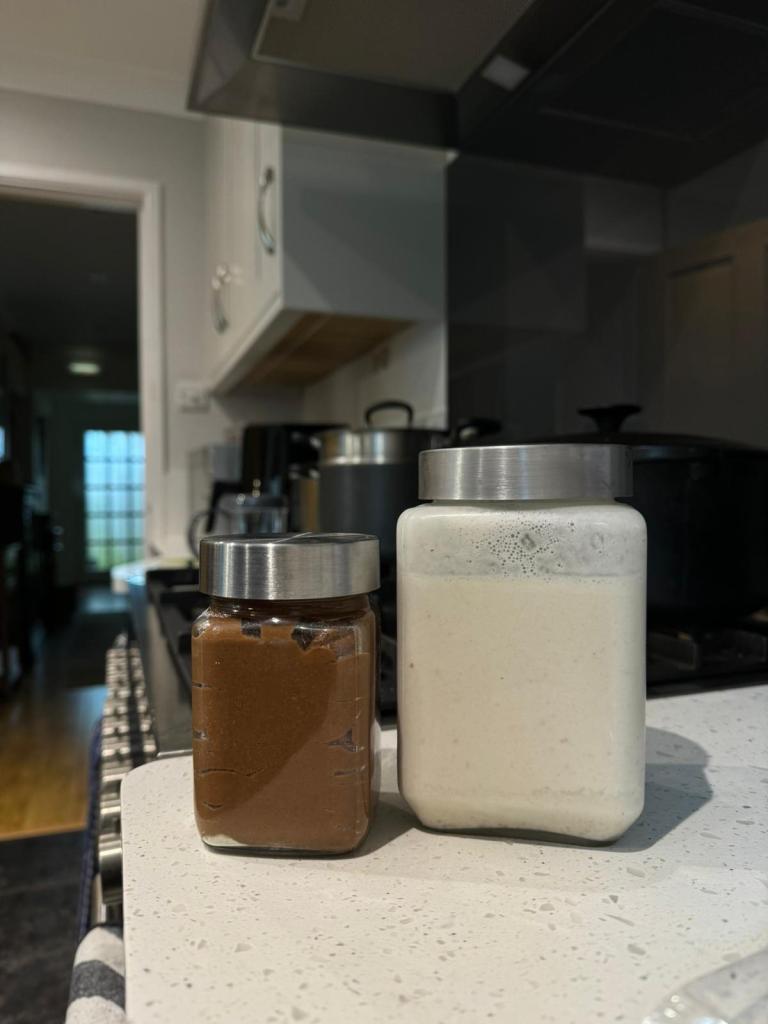 Left Chickpea Nutella, Right Homemade Cashew Milk