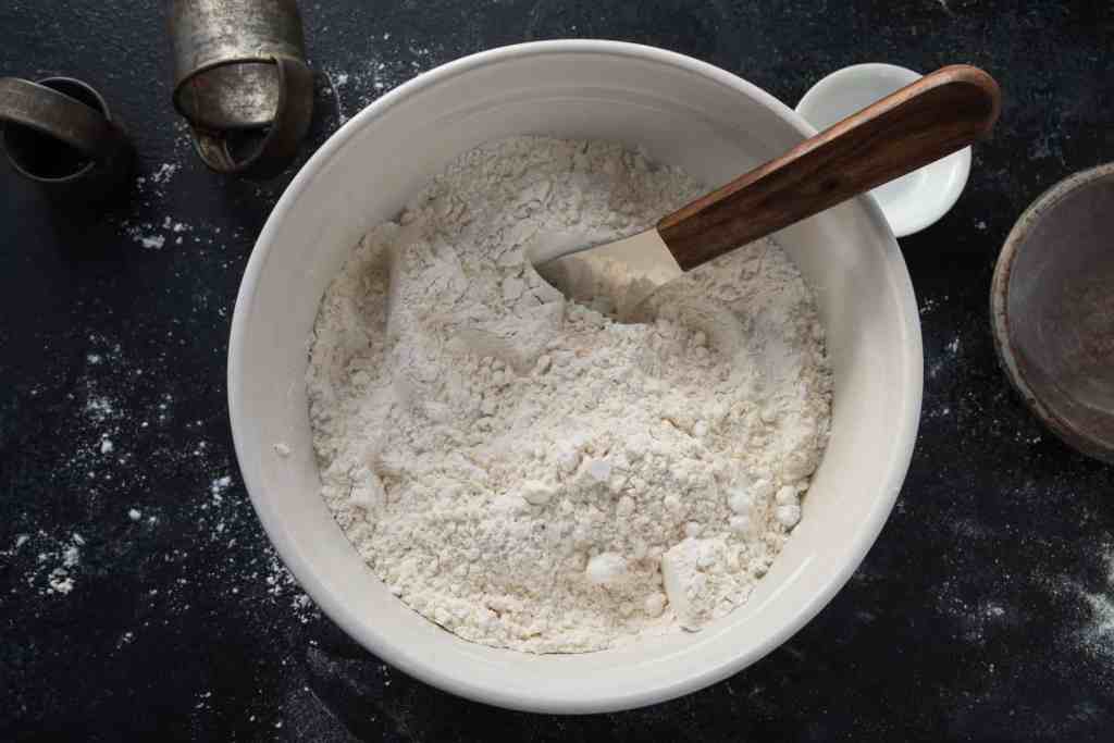 - Add in the plain flour, baking powder and the bicarbonate soda, mix together until a cookie dough is formed.